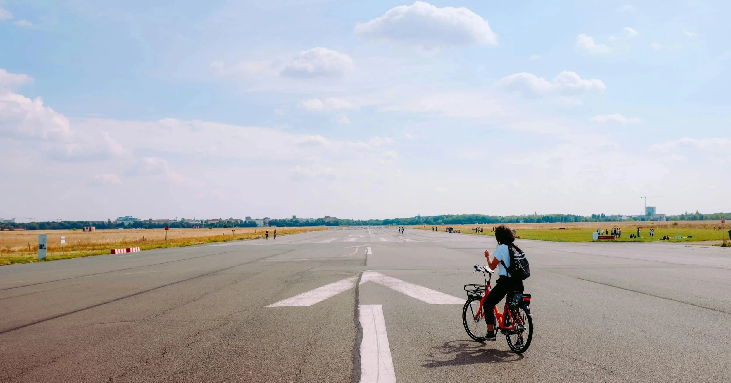 During World War II, Tempelhof Airport in Berlin was a significant site for military operations and as a stage for Nazi propaganda. Once a symbol of oppression and militarization, Tempelhofer Feld now is enjoyed as a free public space with gardens, cycling paths, and open fields for picnicking. Photograph by Adrien Olichon.